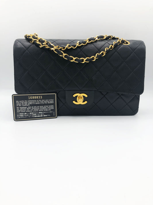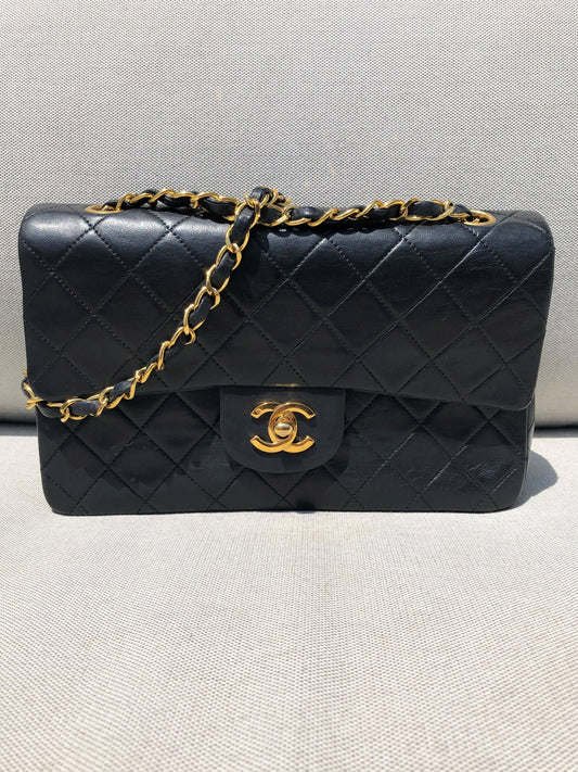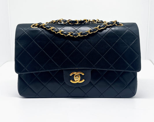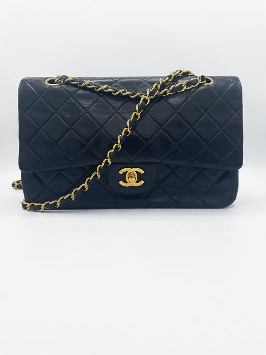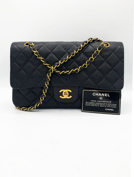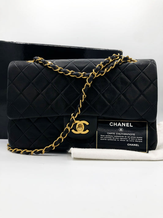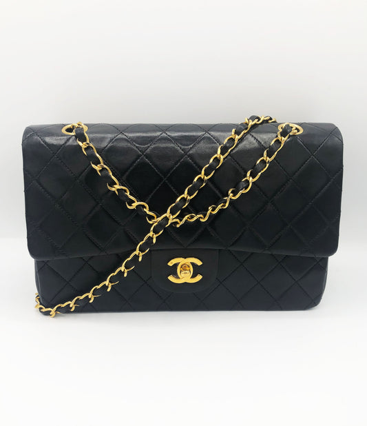 In 1983, Karl Lagerfeld reinterpreted this classic by adding the famous double C clasp, giving birth to the Chanel Timeless bag , also known as the Timeless Classic. Recognizable by its diamond quilting, its leather-wrapped chain, and its timeless lines, it became an absolute it-bag. Available in multiple sizes and materials, the black Chanel bag remains the most iconic version, the ultimate embodiment of luxury, craftsmanship, and Parisian elegance, passed down through generations by the House of Chanel.